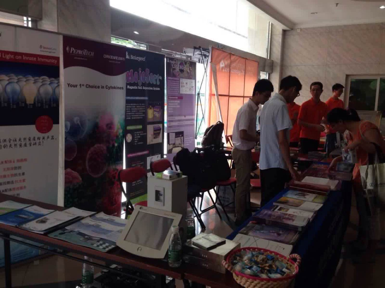 我司在A1號(hào)展臺(tái),準(zhǔn)備了5副免疫殺撲克牌供展覽用,同時(shí)帶來(lái)公司的產(chǎn)品目錄冊(cè)以及免疫組(小彩圖:mechanisms of cell death,DC、巨噬細(xì)胞,中彩圖:Breg,Treg,th17)等資料以及細(xì)胞組的轉(zhuǎn)染、細(xì)胞治療組的PPT和儀器彩頁(yè)等資料供參會(huì)人員瀏覽,展臺(tái)的兩邊我們放置了多因子、磁珠分選等3個(gè)易拉寶供參會(huì)人員觀看,技術(shù)部同事現(xiàn)場(chǎng)進(jìn)行技術(shù)儀機(jī)器演示。