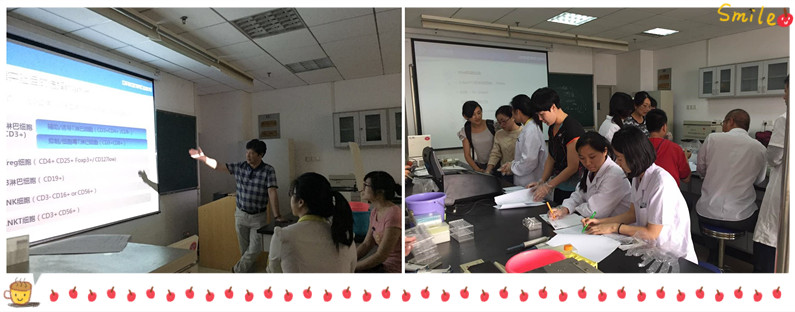 達科為生物第三屆流式培訓(xùn)班——武漢分站實驗上機培訓(xùn)于10月24-25日在華中科技大學(xué)同濟醫(yī)學(xué)院基礎(chǔ)2號樓9層進行。本次實驗內(nèi)容為人外周血的T/B/NK/NKT/Treg的流式檢測,流式細胞儀型號為BD LSRⅡ,為雙激光六色儀器,本次實驗panel共分成兩組,一組檢測T/B/NK/NKT,一組檢測Treg。實驗采取小組教學(xué),上機學(xué)員共計60人。