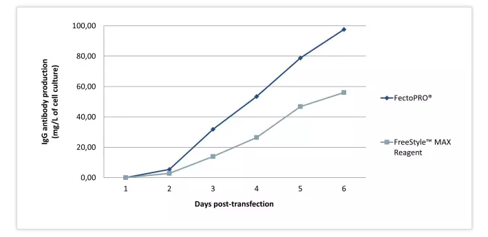圖1. FectoPRO?大幅提高懸浮CHO細(xì)胞的抗體產(chǎn)量。按1×106個(gè)細(xì)胞/ml的密度將細(xì)胞培育在30ml的無血清培養(yǎng)基中,并依照每種試劑說明書推薦用量FectoPRO?(0.8 μg DNA/ml)或FreeStyle?MAX試劑(1.25 μg DNA/ml)進(jìn)行轉(zhuǎn)染。用蛋白質(zhì)G生物感應(yīng)器(fortéBIO? octet RED96 system)對(duì)重組小鼠IgG的產(chǎn)量監(jiān)測(cè)1~6天?!狿roteoGenix SAS(法國)提供的數(shù)據(jù)。