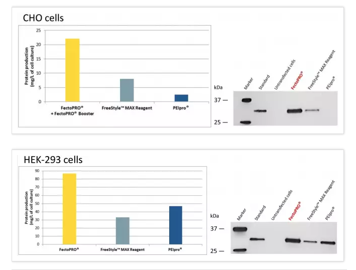 圖2. FectoPRO?大幅提高懸浮CHO和HEK-293細(xì)胞的蛋白產(chǎn)量。按1×106個(gè)細(xì)胞/ml的密度將FreeStyle? CHO-S和HEK-293F細(xì)胞培育在30 ml的無血清培養(yǎng)基中,并依照每種試劑說明書推薦用量FectoPRO?+FectoPRO?輔助藥劑Booster (0.4 μg DNA/ml)、FreeStyle?MAX試劑(1.25 μg DNA/ml)或PEIpro?(1 μg DNA/ml)進(jìn)行轉(zhuǎn)染。用蛋白質(zhì)G親和性定量法(HPLC)和Western Blot檢測(cè)轉(zhuǎn)染后72小時(shí)(CHO細(xì)胞)和120小時(shí)(HEK-293細(xì)胞)的IgG3-Fc (34 kDa)的產(chǎn)量。