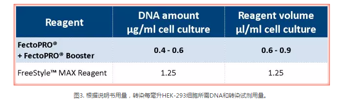 高質(zhì)量質(zhì)粒DNA的制備成本非常高,尤其是在進(jìn)行大規(guī)模蛋白質(zhì)生產(chǎn)時(shí)需要大量的DNA和許多質(zhì)粒。FectoPRO?通過使用0.4~0.6 μg/106/ml的細(xì)胞培養(yǎng)液將DNA成本縮減了40%~60%,使其成為生物制藥生產(chǎn)流程的一項(xiàng)經(jīng)濟(jì)實(shí)惠的選擇。