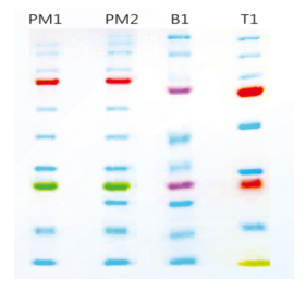 BioSciTM ColorBandTM Prestained Protein Marker 是一種三色預(yù)染的即用型蛋白分子量標(biāo)準(zhǔn)品,包括十種分子量從的預(yù)染重組蛋白,經(jīng)SDS-PAGE凝膠電泳或轉(zhuǎn)膜后可觀察到清晰的彩色蛋白條帶,其中25KD為綠色條帶,75KD為紅色條帶,其余條均為藍(lán)色條帶。