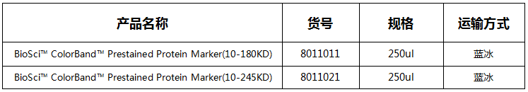 BioSciTM ColorBandTM Prestained Protein Marker產(chǎn)品應(yīng)用于SDS-PAGE凝膠電泳時(shí),可實(shí)時(shí)監(jiān)測蛋白樣品的分離情況,也可以用于評估Western轉(zhuǎn)膜(PVDF、尼龍或硝酸纖維素膜)效率,并粗略的估計(jì)蛋白樣品的分子量。
