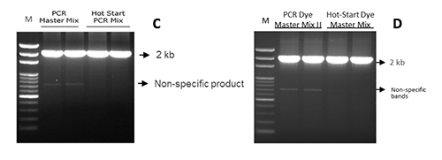 *使用Hot-Start Master Mix(含熱啟動酶)的實驗組PCR產物特異性較高