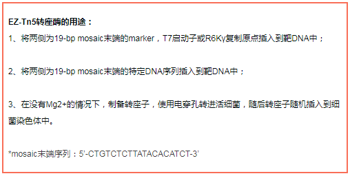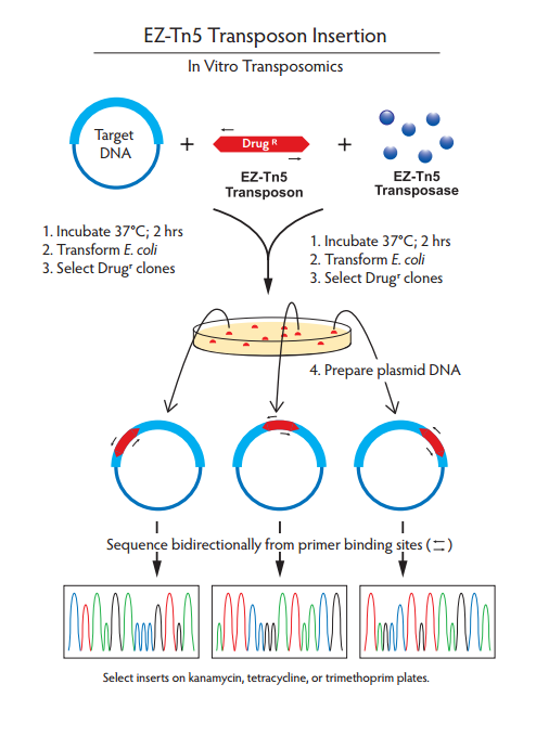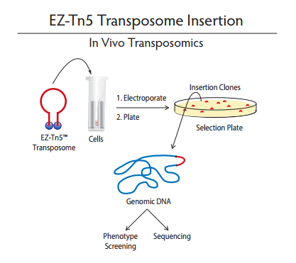 EZ-Tn5轉(zhuǎn)座子可在體外插入到含有靶DNA的載體。當(dāng)EZ-Tn5轉(zhuǎn)座子在沒有鎂離子孵育時,形成穩(wěn)定的EZ-Tn5轉(zhuǎn)座體復(fù)合體,可以被電擊進(jìn)入活細(xì)胞,一旦進(jìn)入細(xì)胞中,轉(zhuǎn)座體由細(xì)胞內(nèi)鎂離子活化,就能隨機(jī)插入到宿主的基因組DNA中。