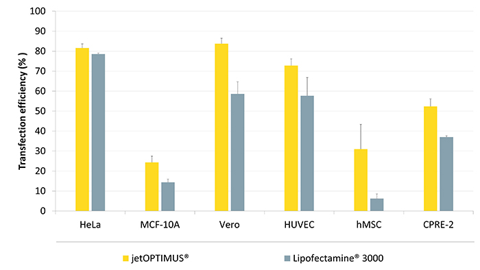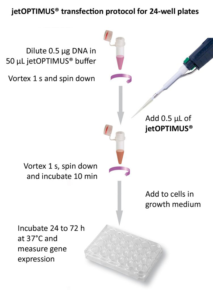 今天的主角jetOPTIMUS?是款陽離子聚合物轉染試劑,因改善了其內化效力和內體逃逸的能力,特別適合難轉貼壁細胞的DNA轉染。