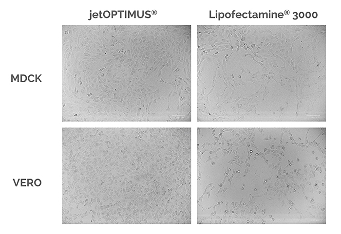 △圖2. 使用jetOPTIMUS?轉染24小時后,細胞仍然健康并保持良好形態(tài)。根據L3K和jetOPTIMUS?說明書要求進行轉染,24小時后在相差顯微鏡下觀察MDCK和VERO細胞的狀態(tài)。