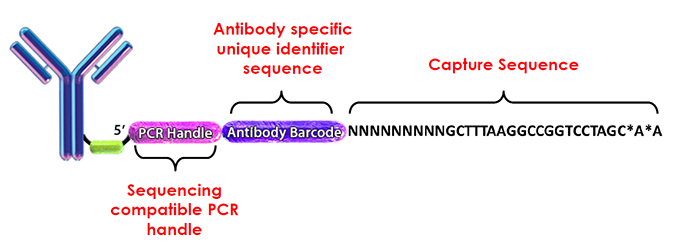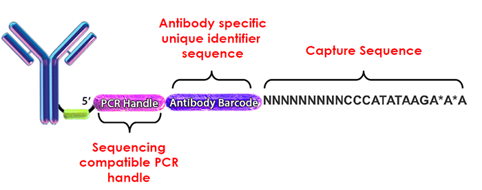 寡核苷酸序列由以下幾部分組成,PCR引物,特異性標簽序列(即特異性Barcode)以及Capture序列。Totalseq?-A、B、C如下: