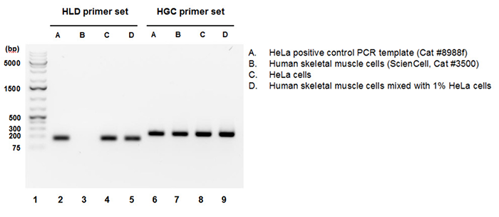 HeLa基因組DNA(gDNA)檢測引物組分(HLD)識(shí)別并擴(kuò)增基因組中不存在于其他人類細(xì)胞的HeLa細(xì)胞特異性序列。