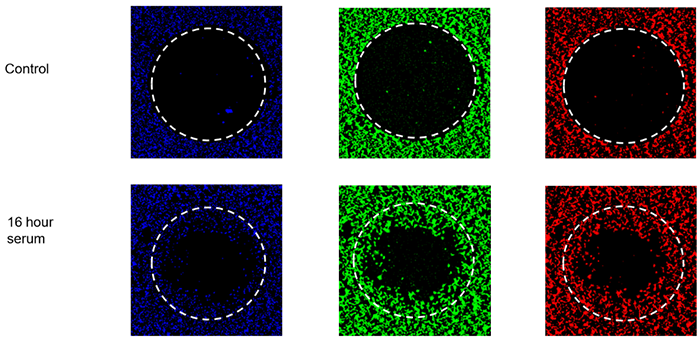細(xì)胞排斥區(qū)分析(間隙封閉法)是Platypus公司獲得專(zhuān)利的技術(shù)。讓細(xì)胞在孔的底部圍繞一個(gè)阻止細(xì)胞生長(zhǎng)的區(qū)域(如在孔底部中央放置阻塞物)生長(zhǎng),實(shí)驗(yàn)在移除阻塞物后開(kāi)始,可觀(guān)察單層細(xì)胞遷移到原先的空白區(qū)域中。