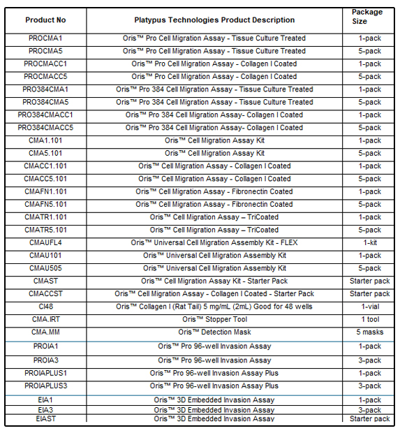 美國(guó)Platypus Technologies公司建立于2000年,是細(xì)胞分析領(lǐng)域產(chǎn)品的耗材供應(yīng)商,熱賣(mài)產(chǎn)品為OrisTM和OrisTM Pro系列細(xì)胞遷移和侵襲實(shí)驗(yàn)試劑盒。其開(kāi)發(fā)的用于檢測(cè)細(xì)胞遷移和侵襲的細(xì)胞排斥區(qū)分析法,克服了Transwell和劃痕實(shí)驗(yàn)的缺點(diǎn)。