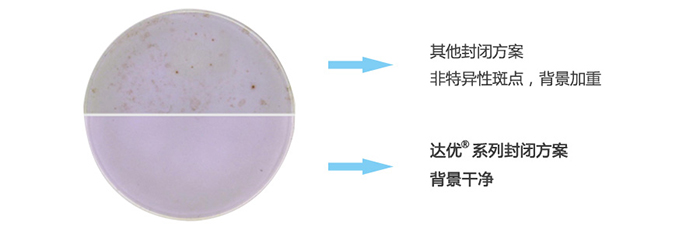 不同的檢測樣本在板孔培養(yǎng)過程中,受各種實驗條件影響,如果封閉不當都可能產(chǎn)生非特異性顯色,導致非特異性斑點的產(chǎn)生或者背景顏色的加重。這將直接影響到最后結(jié)果的判斷分析。達優(yōu)?系列產(chǎn)品通過大量實驗,對不同來源、不同配方封閉方法進行封閉效果的對比試驗,篩選出更高效的封閉系統(tǒng),并將之運用到系列試劑盒產(chǎn)品中。