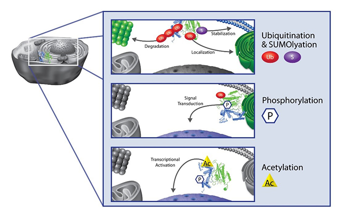 盡管目前已知的PTM的種類超過400種,但只有少數(shù)幾個被詳細(xì)研究過,主要包括甲基化、磷酸化、乙?;⒎核鼗?/span>SUMO化,它們被證明是幾乎所有細(xì)胞的關(guān)鍵調(diào)節(jié)因素,包括信號轉(zhuǎn)導(dǎo)、表觀遺傳學(xué)、基因和蛋白質(zhì)表達、蛋白質(zhì)穩(wěn)定性和定位以及細(xì)胞免疫。