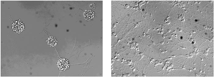 人Midkine增強了培養(yǎng)三天的大鼠胚胎(E18)皮層神經(jīng)元的神經(jīng)突起生長;左(未處理),右(0.4 μg/mL的人Midkine)