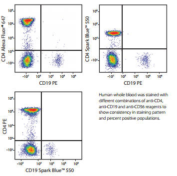用抗CD4和抗CD19的不同熒光抗體組合對人全血染色,結(jié)果顯示Spark Blue?550染色具有有效性以及和其他常見熒光PE、AF647相比染色后相應(yīng)群體比例也具有一致性。