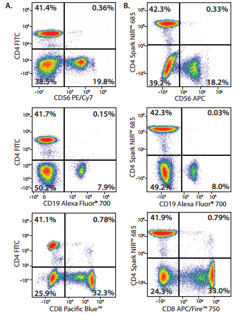 來自相同供體的全血用圖A或B配色方案染色。圖A包括抗人CD4-FITC、CD19-Alexa Fluor700、CD8-PacificBlue TM、CD3-PE以及CD56-PE-Cy7的抗體。圖B包括抗人CD4-Spark NIR TM685、CD19-AlexaFluor 700、CD8-APC-FireTM 750、CD3-PE以及CD56-APC的抗體。