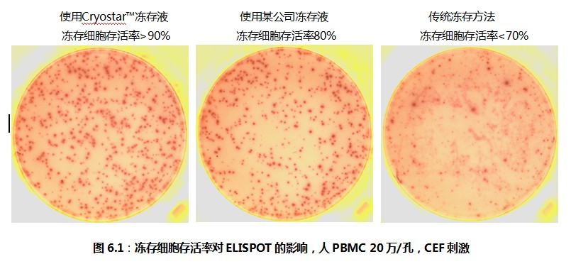 考慮到ELISPOT檢測的特殊性,荷蘭U-CyTech公司經(jīng)過精心的研究與反復的驗證,推出了Cryostar?凍存試劑盒,在凍存液中添加了一系列對細胞有特殊保護作用的保護劑。達科為公司在接到Cryostar?凍存試劑盒之后,在我們的實驗室以及國內數(shù)家客戶的實驗室做了細胞凍存與復蘇的實驗,并且對復蘇之后的細胞做了ELISPOT檢測。結果表明,淋巴細胞的存活率超過90%,ELISPOT斑點形成頻率與新鮮細胞完全相同。參見圖6.1。