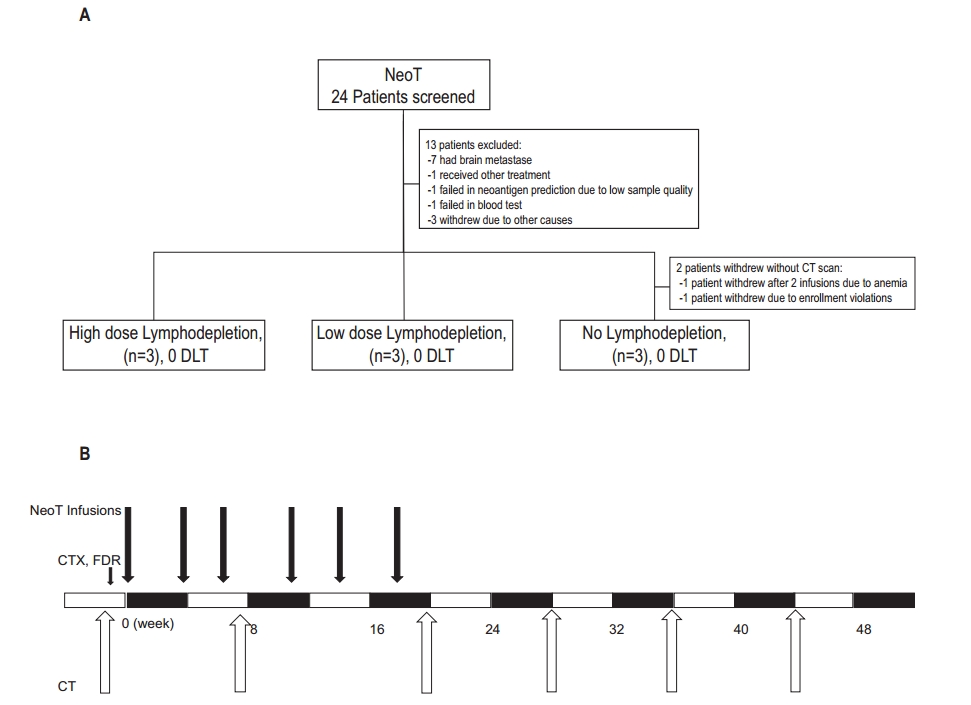 針對這些問題,中山大學徐瑞華團隊在2023年6月10日發(fā)表了題為“A pilot study of lymphodepletion intensity for peripheral blood mononuclear cell-derived neoantigen-specific CD8+ T cell therapy in patients with advanced solid tumors”的研究論文。該研究開發(fā)了一種從癌癥患者的外周血單個核細胞(PBMCs)中產(chǎn)生個性化Neo-T(新抗原特異性CD8+ T細胞)的方法。作者建立了一個流程,包括通過生物信息學分析預測新抗原,并在25天內大規(guī)模擴增新抗原特異性T細胞。為了評估Neo-T治療的臨床療效并確定Neo-T治療的最佳淋巴細胞耗竭強度,作者進行了一項首次在人體中使用氟達拉濱和環(huán)磷酰胺增加劑量的Neo-T治療的研究。該研究是一項開放標簽I期臨床試驗(NCT02959905),包括標準治療難治的局部晚期或轉移性實體瘤患者。