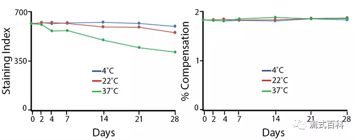 將PE/Fire? 700標(biāo)記的抗體分裝后分別保存在4℃、22℃和37℃下。穩(wěn)定性可以根據(jù)抗體的染色指數(shù)(staining index)和熒光補(bǔ)償百分比來衡量,隨著保存時(shí)間的延長(zhǎng),3種溫度保存條件下光補(bǔ)償百分?jǐn)?shù)并沒有發(fā)生改變,但是37℃的保存條件染色指數(shù)下降了約36%,22℃保存條件的染色指數(shù)下降了約12%,這主要是由于這兩種保存條件下抗體的非特異性染色背景升高引起的(檢測(cè)平臺(tái)為5激光Cytek? Aurora 光譜流式)。