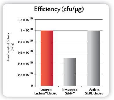 E. cloni? 10G ELITE電轉感受態(tài)轉化效率≧2×1010 cfu/μg,E. cloni? 10G化學轉感受態(tài)轉化效率≧1×109 cfu/μg;