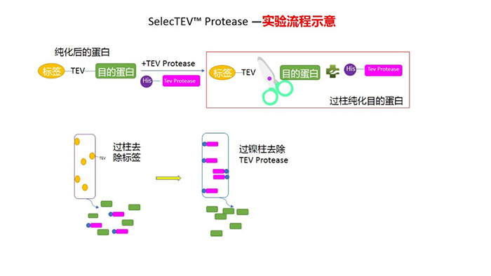 SelecTEV?蛋白酶是一種基因工程改造的煙草蝕刻病毒(TEV)蛋白酶,通過His標(biāo)簽的親和層析從大腸桿菌中純化,SDS-PAGE分析表明其純度為90%。SelecTEV?蛋白酶能夠識別Glu-Asn-Leu-Tyr-Phe-Gln-Gly七個氨基酸以及與其密切相關(guān)的序列,并在Gln和Gly殘基之間進行切割。 這七種氨基酸序列在蛋白質(zhì)中很少見,使得SelecTEV?蛋白酶成為從融合蛋白中去除標(biāo)簽的理想選擇。利用蛋白酶N-末端的His標(biāo)簽通過親和層析即可從酶切反應(yīng)中除去SelecTEV?蛋白酶。