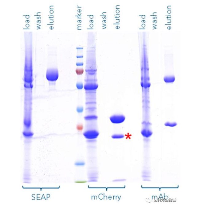 此外,我們也測試了其他的蛋白,例如SEAP(72 kDa)或抗體(mAb,其重鏈為55kDa)。圖B為以Strep-Tactin?XT純化SEAP-TST、mCherry-TST與mAb-TST的SDS-PAGE分析結(jié)果,可見對于不同蛋白,Strep-tag?系統(tǒng)都能純化出高純度的目標(biāo)蛋白。(注:紅色標(biāo)記處為 mCherry的降解產(chǎn)物,非雜帶)