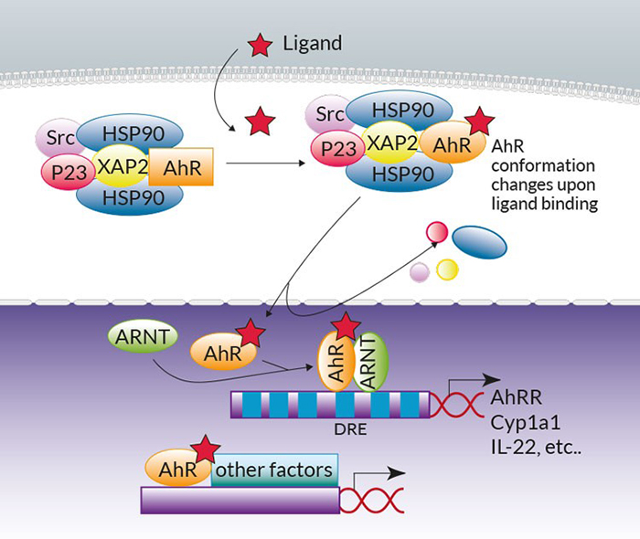 典型AhR訊號已經(jīng)被廣泛綜述過1。簡而言之,在沒有配體的情況下,AhR位于細(xì)胞質(zhì)中Hsp90:XAP2:p23:Src伴侶蛋白復(fù)合物內(nèi),當(dāng)配體結(jié)合時,復(fù)合物發(fā)生構(gòu)象變化并轉(zhuǎn)移到細(xì)胞核中。伴侶蛋白被釋放,AhR和AhR核轉(zhuǎn)位子(ARNT)異源二聚。在細(xì)胞核中,AhR:配體:ARNT三聚體與AhR靶基因上游調(diào)節(jié)區(qū)域的二噁英應(yīng)答元件(DRE)結(jié)合,以控制包括細(xì)胞色素P450依賴性單加氧酶Cyp1a1、AhR 抑制因子(AhRR)和IL-22白細(xì)胞介素的轉(zhuǎn)錄。值得注意的是,無輪是在基因組水平上通過與其他轉(zhuǎn)錄因子(例如NF-κB)相關(guān)聯(lián),還是在非基因組水平上(例如通過釋放Src激酶),非典型AhR信號通路也有被報道過2,3。